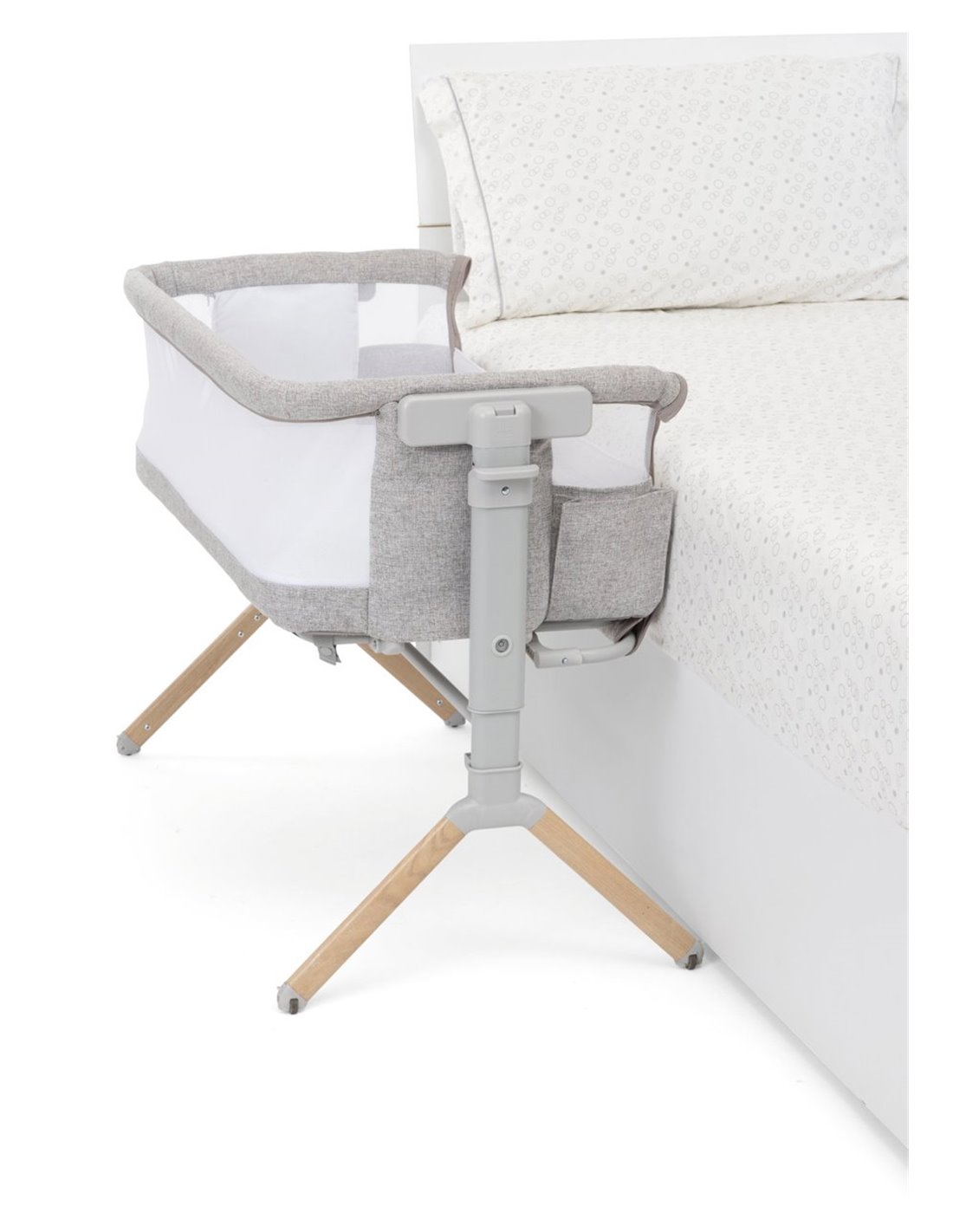 Łóżeczko posiada 11-stopniową regulację wysokości, dzięki czemu można je idealnie dopasować do każdego rodzaju łóżka, niezależnie od jego wysokości. Innowacyjny system montażu z bocznym przesuwaniem pozwala ustawić łóżeczko przy łóżkach wyposażonych w szuflady, co sprawia, że jego użycie jest wygodne i uniwersalne w każdym domu.