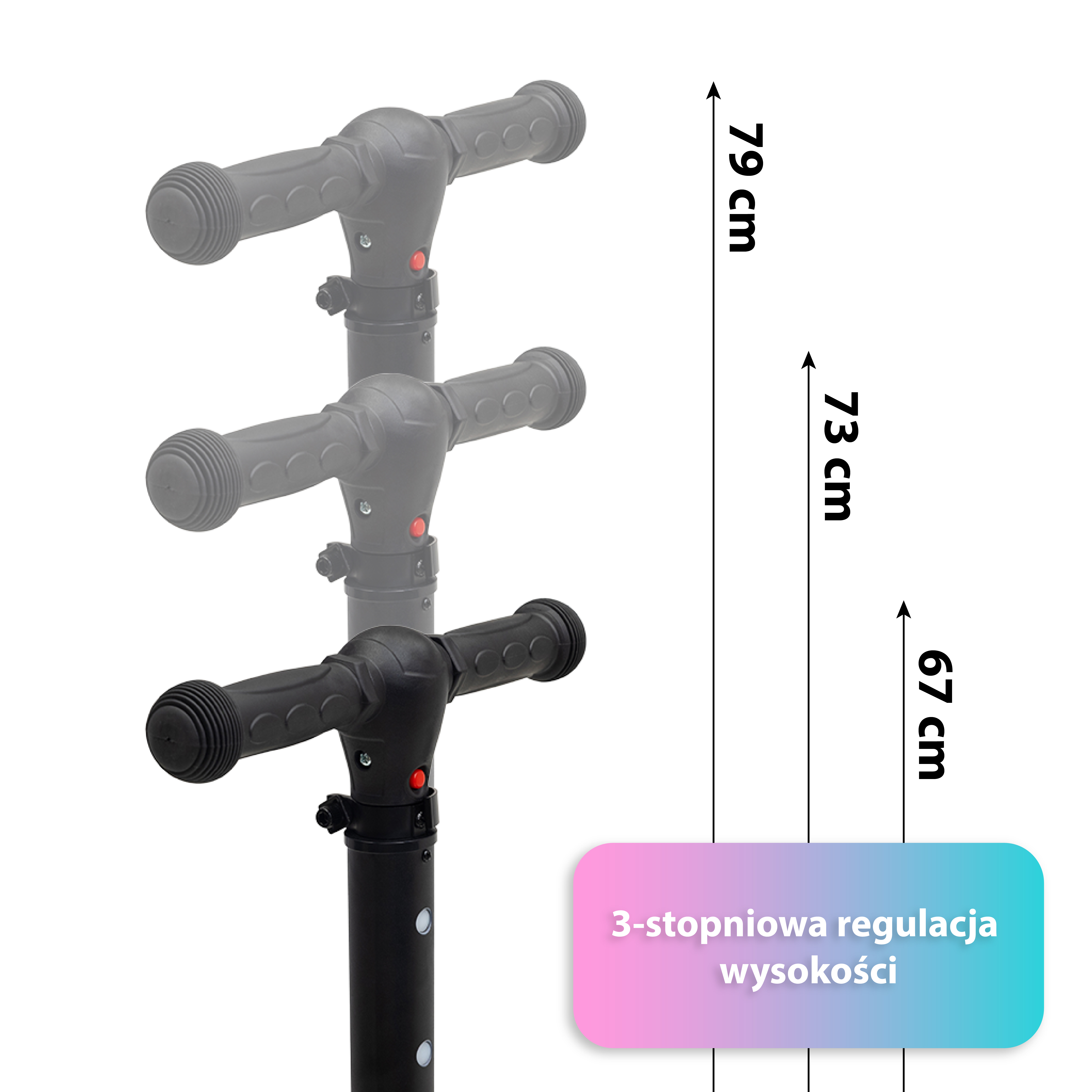 Hulajnoga ma 3 poziomy regulacji wysokości rączki, co umożliwia dopasowanie do wzrostu i wieku dziecka. Świetnie sprawdzi się dla maluchów już od 3 lat – jedna hulajnoga na wiele sezonów! |