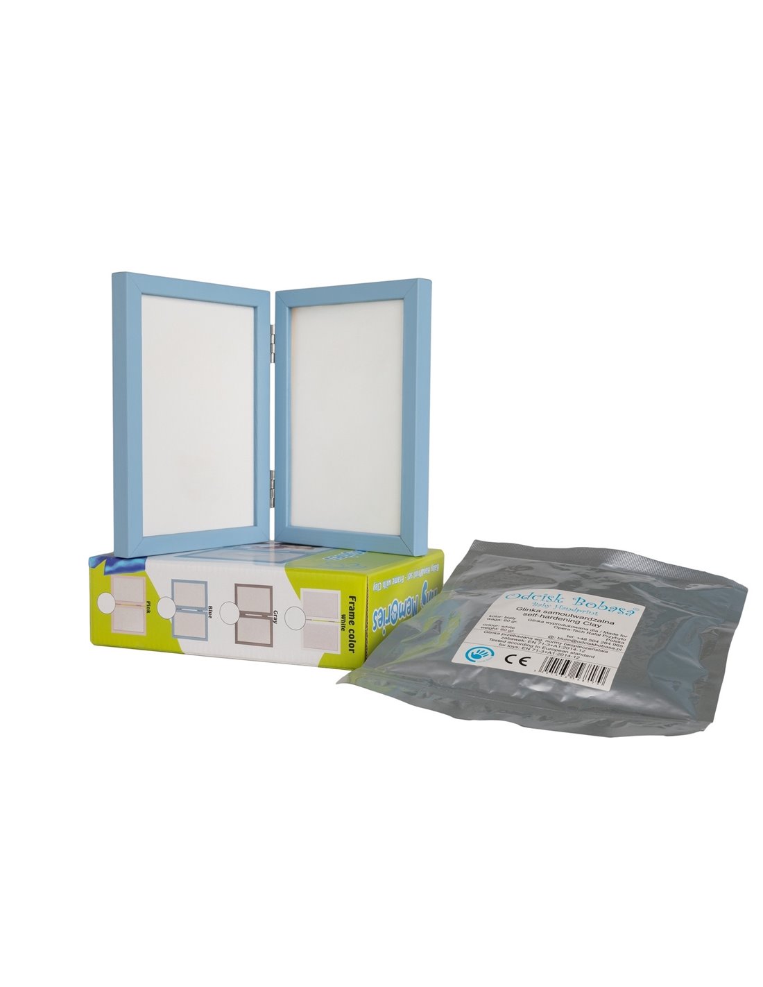 W skład zestawu wchodzi podwójna ramka z naturalnego drewna oraz miękka, plastyczna glinka, która została przebadana w Polsce i spełnia najnowsze europejskie normy bezpieczeństwa zabawek. Glinka jest wyjątkowo delikatna i łatwa w formowaniu, dlatego wykonanie odcisku jest całkowicie bezpieczne nawet dla noworodków.