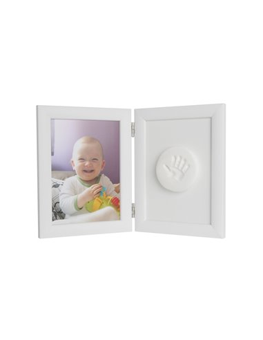 Ramka o wymiarach 13x18 cm posiada dwa pola – jedno na odcisk dłoni lub stopy dziecka, a drugie na zdjęcie maluszka.