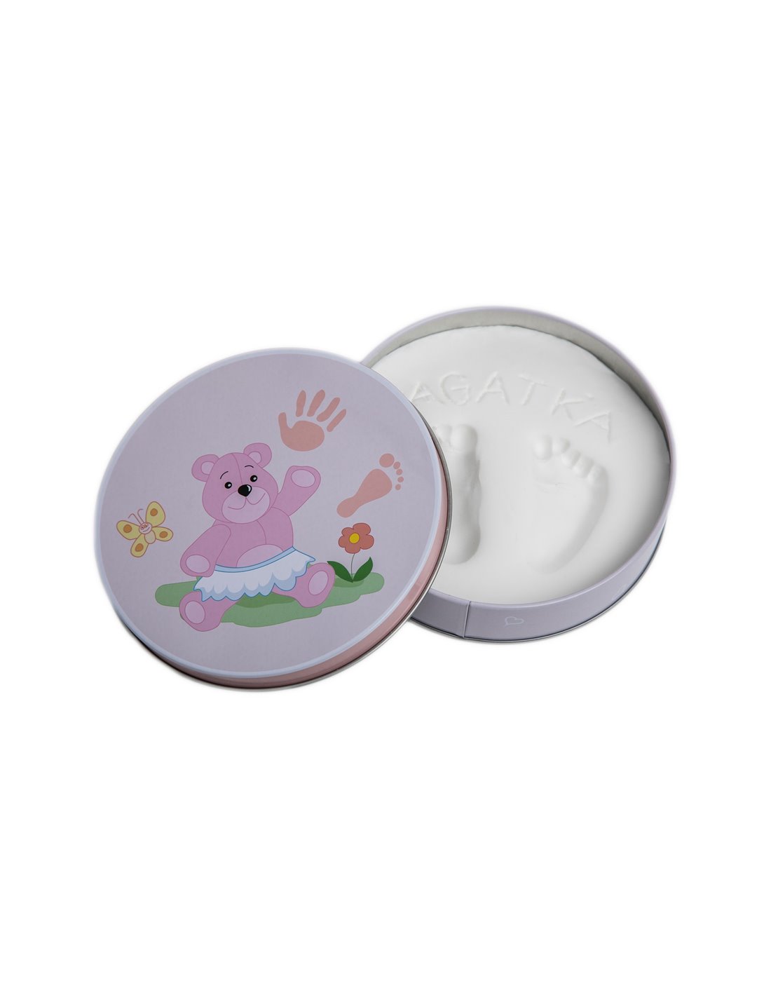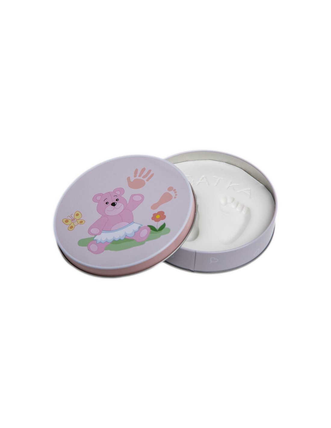 Na spodzie wieczka znajduje się metryczka z miejscem na wpisanie imienia, wieku i daty wykonania odcisku – to wyjątkowy sposób, by zachować wspomnienie pierwszych chwil życia dziecka na długie lata.